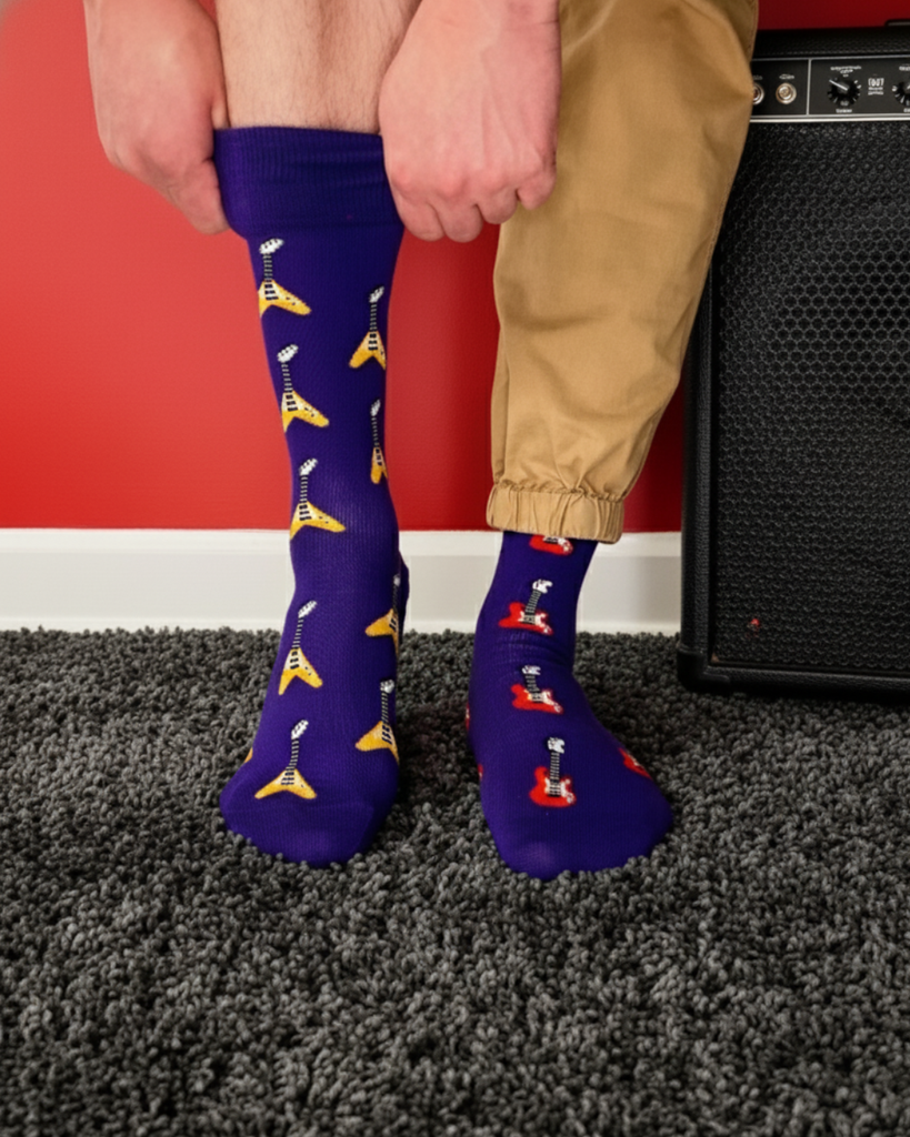 Turn the volume up to eleven! These Electric Guitar Socks are ready to rock, roll, and maybe even solo. Perfect for air guitar pros, rock legends, and anyone who likes their socks loud.