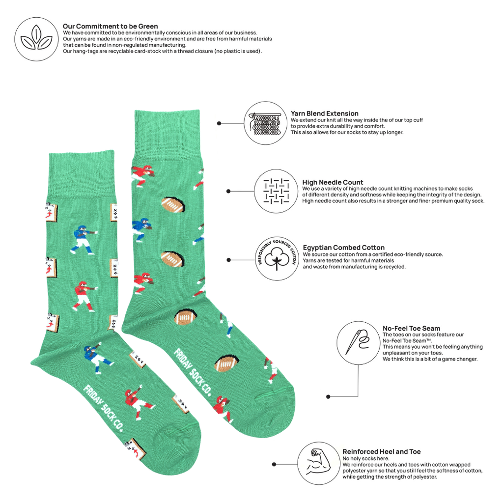 Our family-owned partner factory makes Friday Sock Co. socks in small batches, which helps to ensure unparalleled quality control! Polyamides left over during yarn production are recycled or re-used. All of our socks are made from safe materials and cotton that is Eco Friendly Certified.