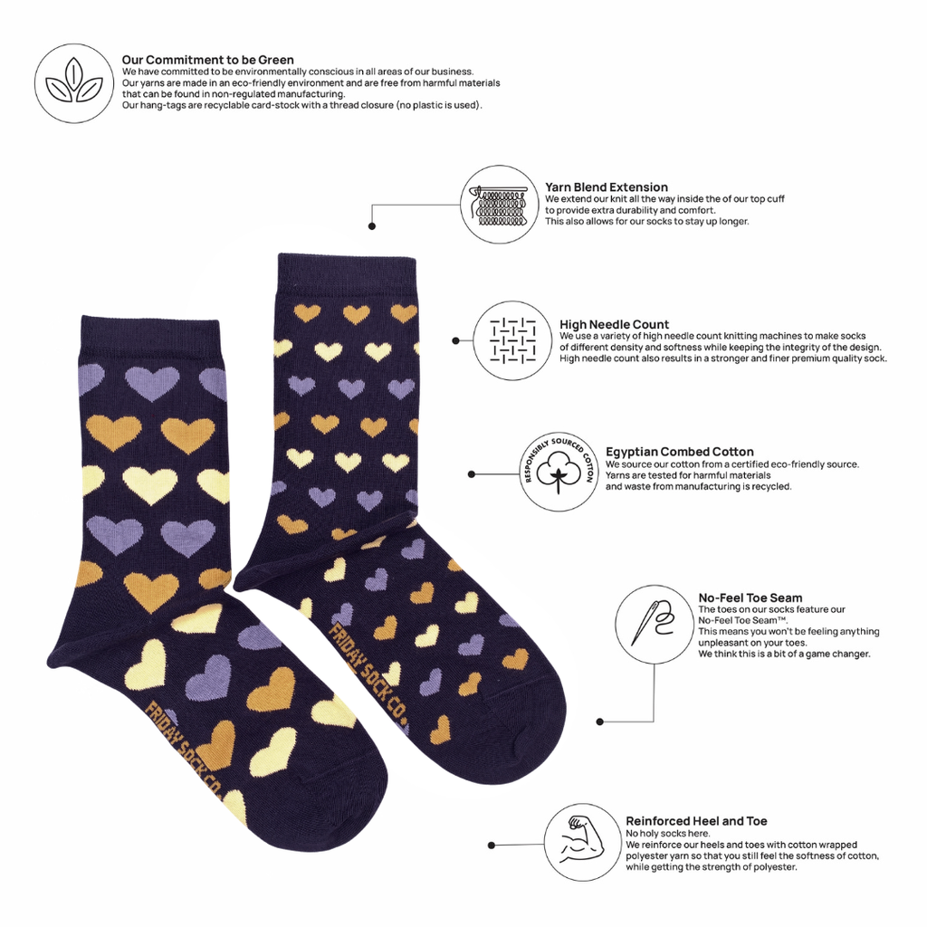 Our family-owned partner factory makes Friday Sock Co. socks in small batches, which helps to ensure unparalleled quality control! Polyamides left over during yarn production are recycled or re-used. All of our socks are made from safe materials and cotton that is Eco Friendly Certified.