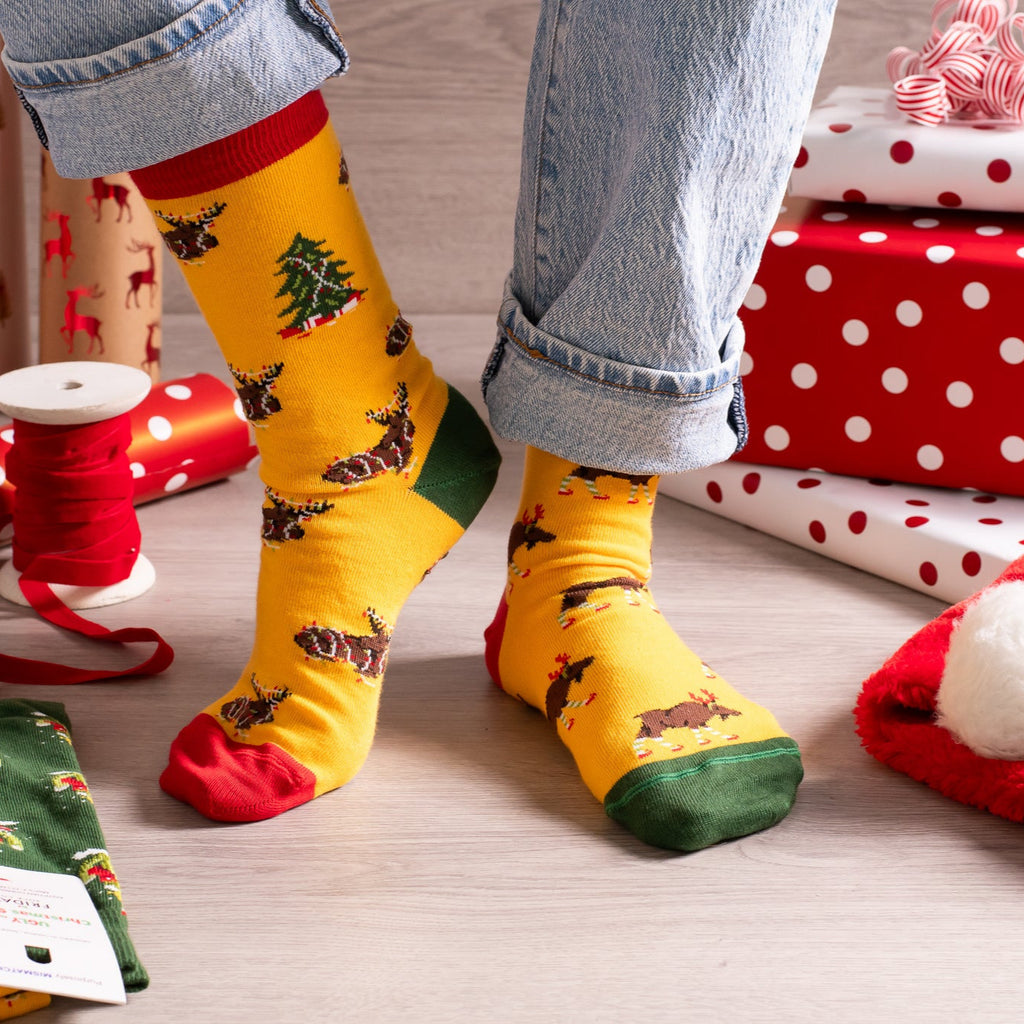 There's a moose on the loose! And it's making your feet dance in these fun and festive purposely mismatched socks.